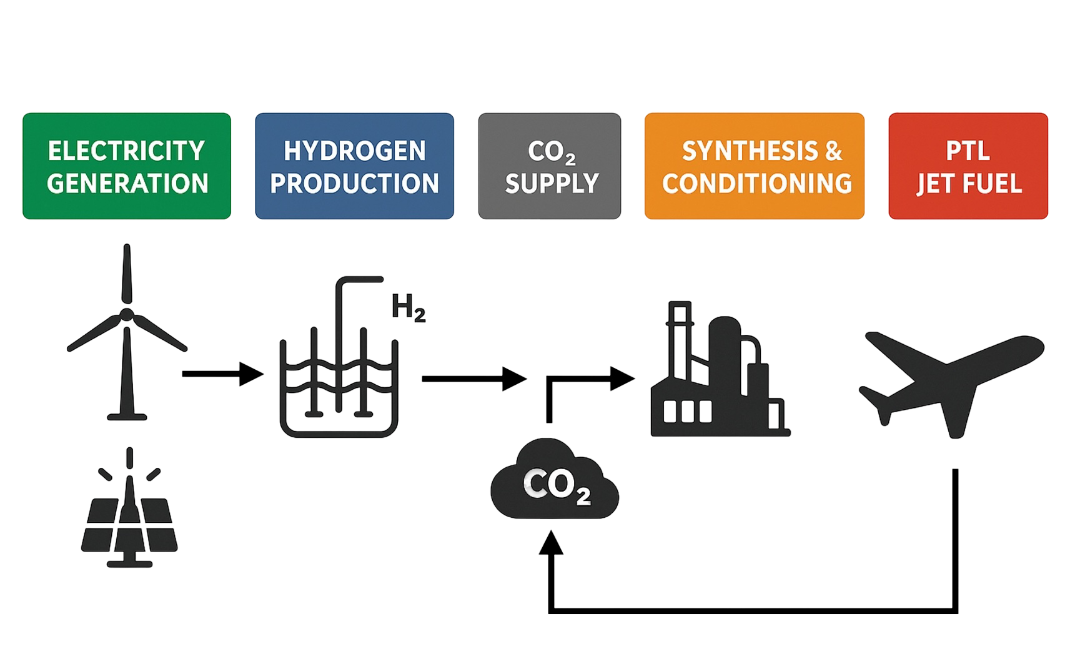 Die Power-to-Liquid (PtL)-Technologie wandelt erneuerbaren Strom in flüssige Kraftstoffe um und bietet eine klimafreundliche Alternative zu fossilen Brennstoffen. Zunächst wird durch Elektrolyse Wasser in Wasserstoff (H₂) und Sauerstoff (O₂) gespalten, wobei ausschließlich erneuerbarer Strom genutzt wird. Anschließend wird der gewonnene Wasserstoff mit Kohlendioxid (CO₂) kombiniert, das entweder aus industriellen Abgasen oder der Luft abgeschieden wird (Direct Air Capture), oder mit oder Kohlenmonoxid (CO), das aus dem CO₂ gewonnen werden kann. Durch chemische Prozesse wie die Fischer-Tropsch- oder Methanol-Synthese entsteht daraus ein synthetischer Rohstoff, der z.B. zu Kerosin weiterverarbeitet wird. Derartige Kraftstoffe sind nahezu CO₂-neutral, da sie bei der Verbrennung nur das CO₂ freisetzen, das zuvor entnommen wurde. Die Technologie trägt dazu bei, fossile Energieträger zu ersetzen und die Abhängigkeit von Erdöl zu verringern. Herausforderungen bestehen noch in den hohen Produktionskosten und dem hohen Energiebedarf der Elektrolyse. Dennoch gilt PtL als vielversprechende Lösung, die Treibhausgasemissionen im Flugverkehr drastisch zu reduzieren. Mit zunehmender Skalierung und politischen Fördermaßnahmen könnten diese synthetischen Kraftstoffe eine Schlüsselrolle in der Energiewende spielen.